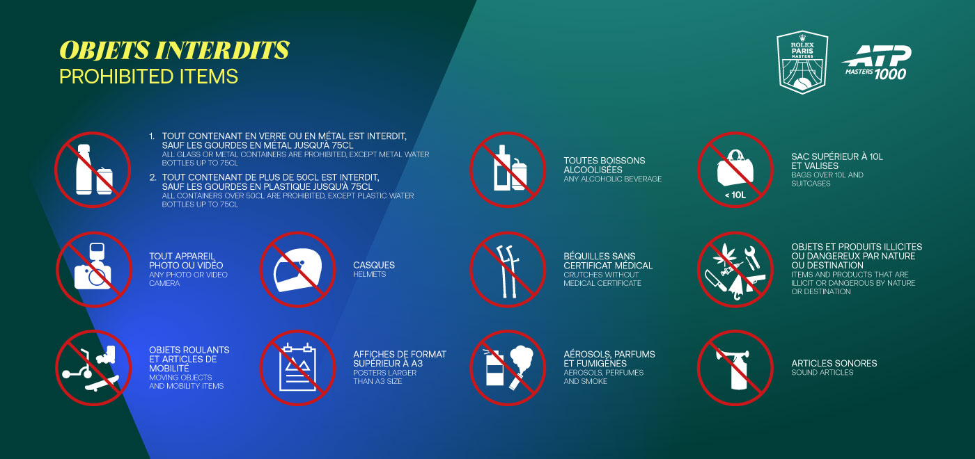 For security reasons, it is strictly forbidden to bring specific items into the Paris La Défense Arena (see list of prohibited items below). These objects may be left in a locker at the entrance.