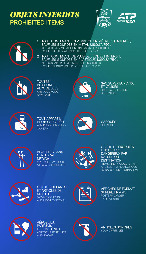 Pour des raisons de sécurité, il est formellement interdit d’introduire dans l’enceinte de Paris La Défense Arena certains objets (voir la liste des objets interdits ci-dessous). Ces objets pourront être laissés en consigne à l'entrée.